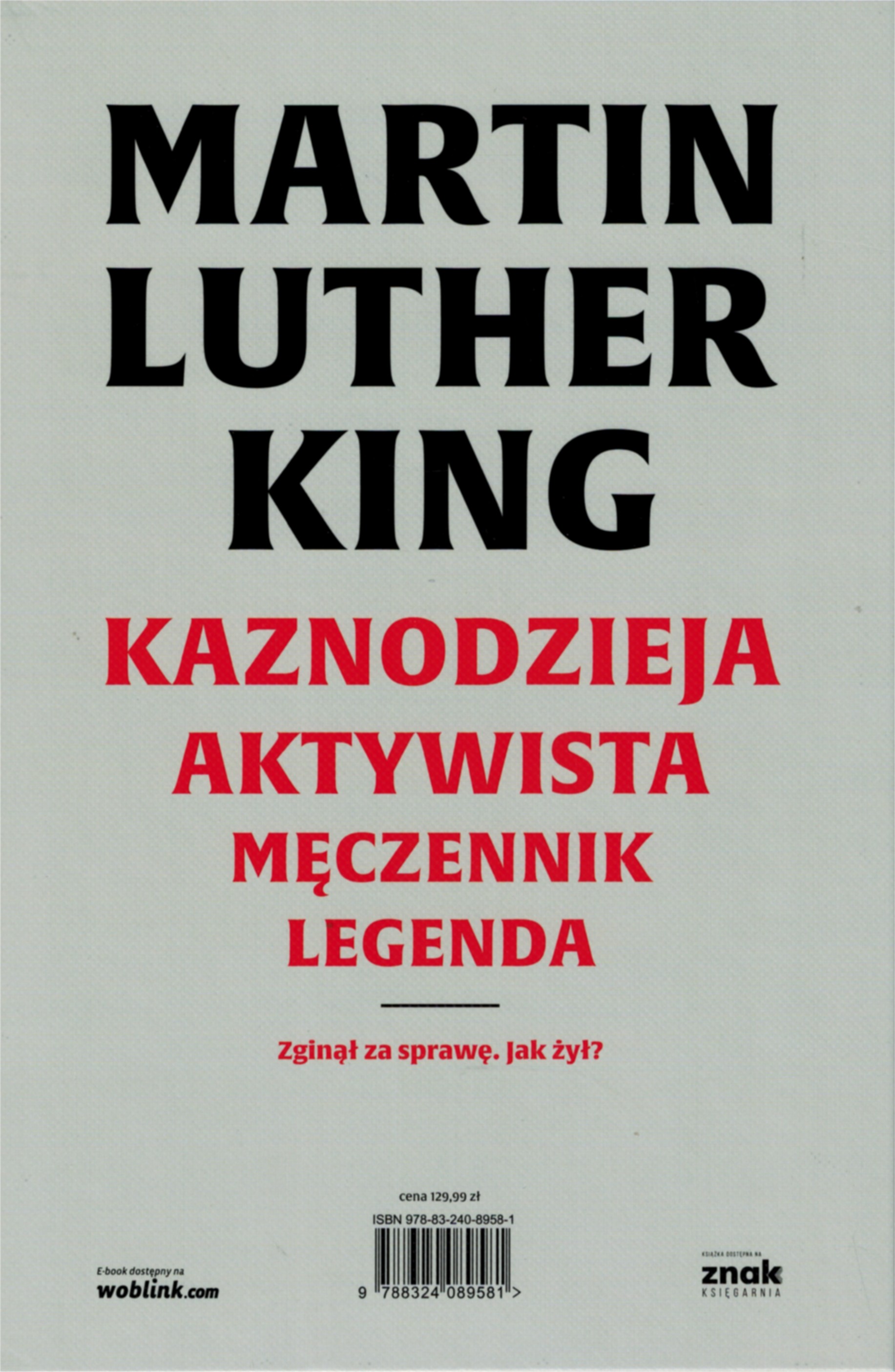 Martin Luther King Kaznodzieja Aktywista Męczennik Legenda Pierwsza w Polsce biografia najsłynniejszego amerykańskiego obrońcy praw człowieka jest pozycją doskonale udokumentowaną - jako jedyna na świecie zawiera informacje z niedawno odtajnionych akt FBI - i kompletną. Jonathan Eig, dziennikarz i biograf m.in. Muhammada Alego, ściąga Kinga z piedestału i otrzepuje go z kurzu. Pokazuje przywódcę, który budował swoją strategię, zmagając się z depresją. Dopuszczał wyłącznie pokojowe protesty, ale nie potrafił żyć w pokoju z samym sobą. Przez trzynaście lat aktywności politycznej rozumiał, że walka może kosztować go życie - i wierzył, że zmieni oblicze współczesnej Ameryki. King. Biografia to zarówno kronika drogi MLK od powiatowego kaznodziei do lidera ruchu praw obywatelskich, jak i historia życia w wiecznym rozdarciu. Napisana jak trzymający w napięciu thriller, została nominowana do National Book Award i była jedną z ulubionych lektur prezydenta Baracka Obamy w 2023 roku.