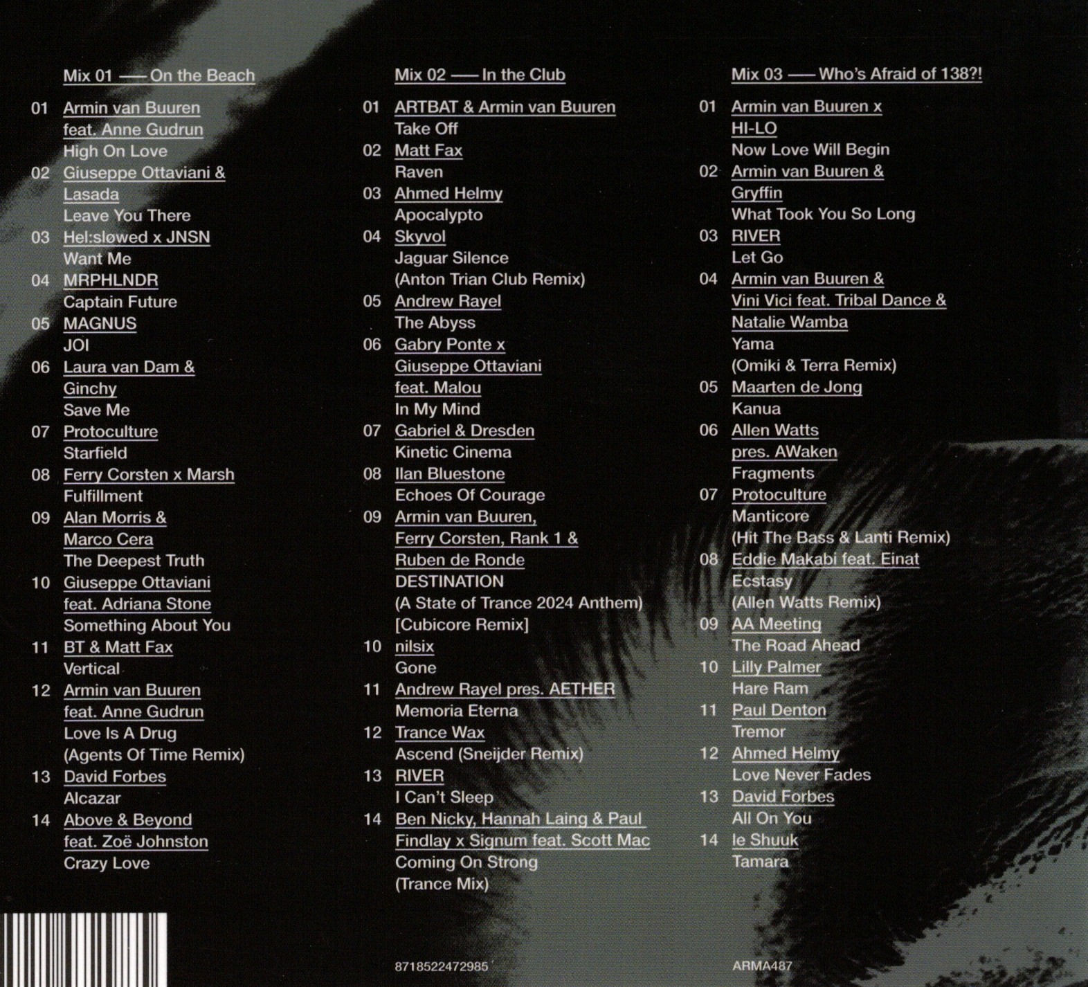 Zawiera: Zawiera: Mix 1, On the beach: 1. High On Love/ Armin van Buuren feat. Anne Gudrun ; 2. Leave You There/ Giuseppe Ottaviani & Lasada ; 3. Want Me/Hel:sløwed x JNSN ; 4. Captain Future/ MRPHLNDR ; 5. JOI/ MAGNUS ; 6. Save Me/ Laura van Dam & Ginchy ; 7. Starfield/Protoculture ; 8. Fulfillment/Ferry Corsten x Marsh ; 9. The Deepest Truth/Alan Morris & Marco Cera ; 10. Something About You/ Giuseppe Ottaviani feat. Adriana Stone ; 11. Vertical/ BT & Matt Fax ; 12. Love Is A Drug (Agents Of Time Remix)/Armin van Buuren feat. Anne Gudrun ; 13. Alcazar/ David Forbes ; 14. Crazy Love/ Above & Beyond feat. Zoë Johnston.
