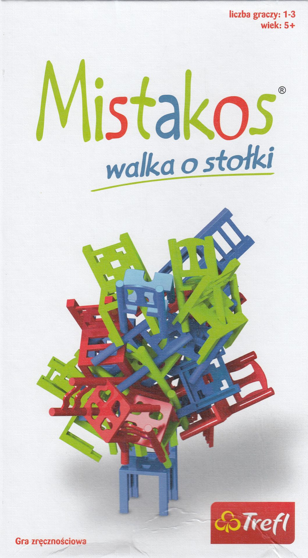 Gra zręcznościowa i świetna zabawa dla graczy w każdym wieku, w której o zwycięstwie nie decyduje szybkość, ale precyzja i skupienie. Gracz wybiera krzesło w swoim kolorze i dokłada do stosu poprzednich tak, by cała konstrukcja nie legła w gruzach. Kto pierwszy skusi, otrzyma karne punkty. Zadanie nie jest proste, ponieważ trzeba dobrze wybrać miejsce i stabilnie zahaczyć krzesło. Za nogę, oparcie, siedzisko - bez różnicy, byle zachować konstrukcję![sklep.trefl.com]