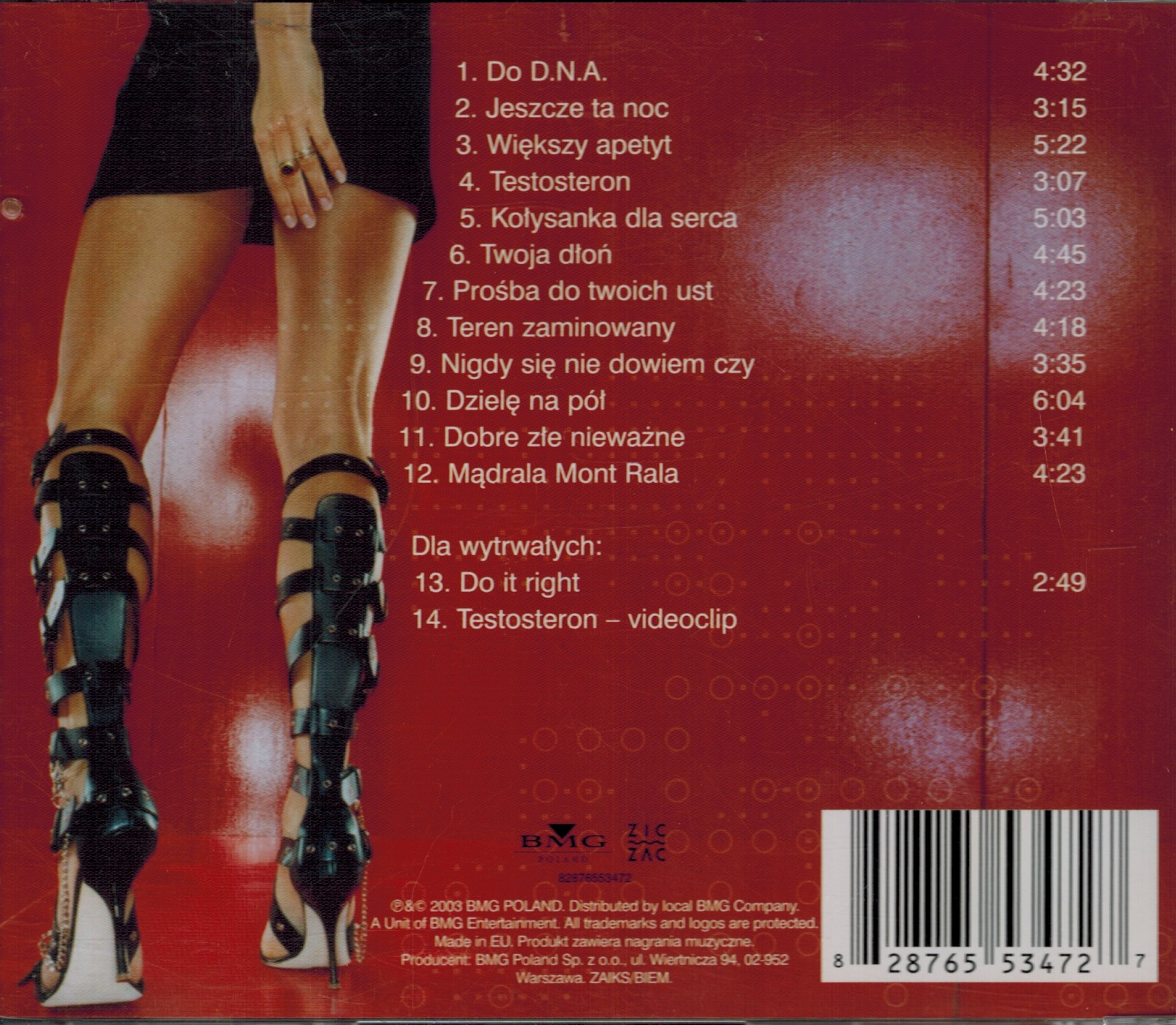 Zawiera: Zawiera: Do D.N.A. ; Jeszcze ta noc ; Większy apetyt ; Testosteron ; Kołysanka dla serca ; Twoja dłoń ; Prośba do twoich ust ; Teren zaminowany ; Nigdy się nie dowiem czy ; Dzielę na pół ; Dobre złe nieważne ; Mądrala Mont Rala ; Do it right.