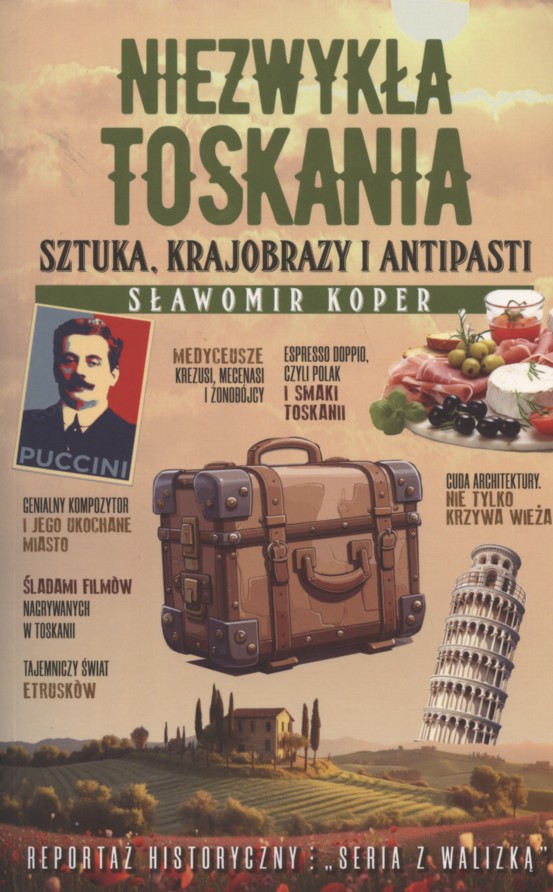 Toskania. Sama nazwa wywołuje skojarzenia z fantastycznymi krajobrazami i dziełami sztuki zgromadzonymi w zachwycających kościołach i galeriach. Ponad jedna trzecia najważniejszych zabytków z terenu Włoch znajduje się właśnie w Toskanii. Do tego - rewelacyjna kuchnia, która sprawia, że kraina ta wydaje się przedsionkiem raju. Stale powstają filmy i książki, których akcja osadzona jest w toskańskich dekoracjach. Niezwykła Toskania powstała jako pokłosie dwudziestu lat wypraw Sławomira Kopra do tej bajecznej krainy. Autor każdego roku spędzał tydzień w innym mieście by spokojnie poznać okolicę i przekazać czytelnikowi jak najwięcej barw, smaków i zapachów Toskanii. Florencja - krwawe dni stolicy Toskanii Pani Walewska na Elbie - babie lato cesarza Bonaparte Siena - nieśmiertelne palio i przepyszne Gnocchi con pollo Medyceusze - mecenasi i żonobójcy Lukka – ukochane miasto Pucciniego i Antipasti Toscani Tajemniczy świat Etrusków - Orvieto, Chiusi, Fiesole Śladami niesfornego mnicha i jego syna - Florencja, Prato, Spoleto Piza - śniadanie po włosku w cieniu Krzywej Wieży San Gimignano - Manhattan średniowiecza Samochodem przez wzgórza Toskanii - Piza, Pistoia, Chiusure, Vinci Wódz Maximus i jego toskańska posiadłość, czyli Toskania i film - Cortona, Lucignano, Montepulciano, Pienza, Arezzo i Volterra [nota wydawcy]