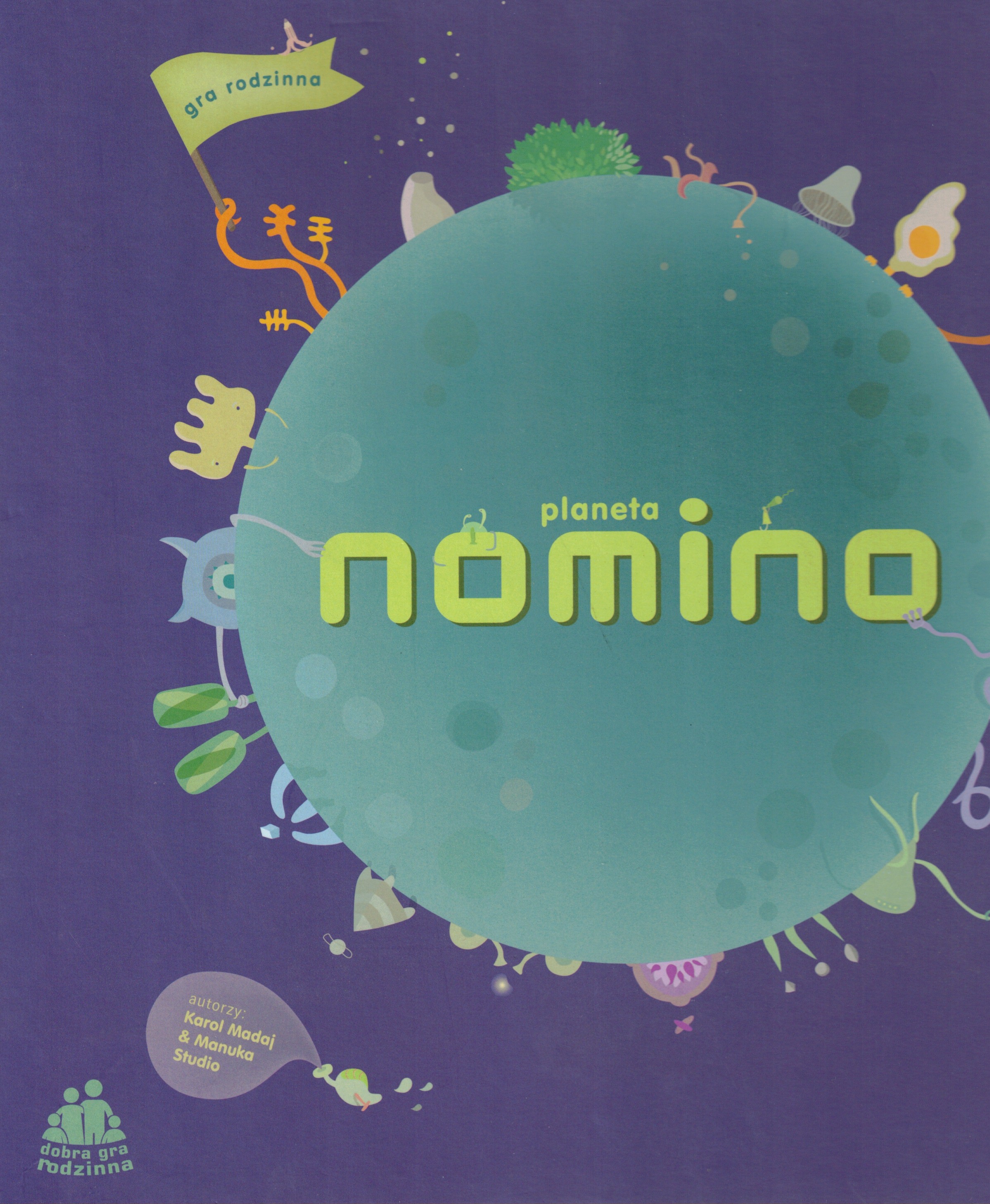 Planeta Nomino : gra rodzinna / autorzy: Karol Madaj & Manuka Studio. - Gdynia : Trefl, copyright 2016. - 1 gra (plansza, 72 karty z obiektywami, 156 kart z nazwami, 24 karty misji, drewniany bączek) : drewno, tektura, kolor ; 26x26x8 cm + 1 instrukcja ([4] strony : ilustracje ; 25 cm).
