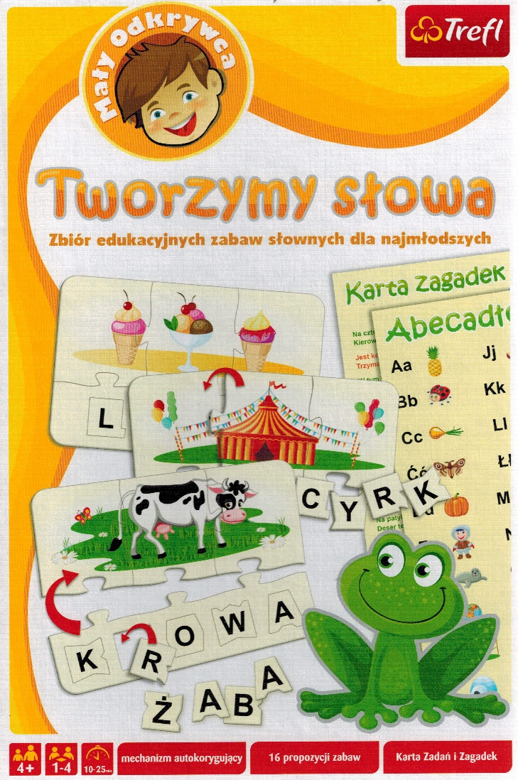 W pudełku : 16 puzzlowych obrazków z podpisem złożonym z liter, karta zagadek, instrukcja.